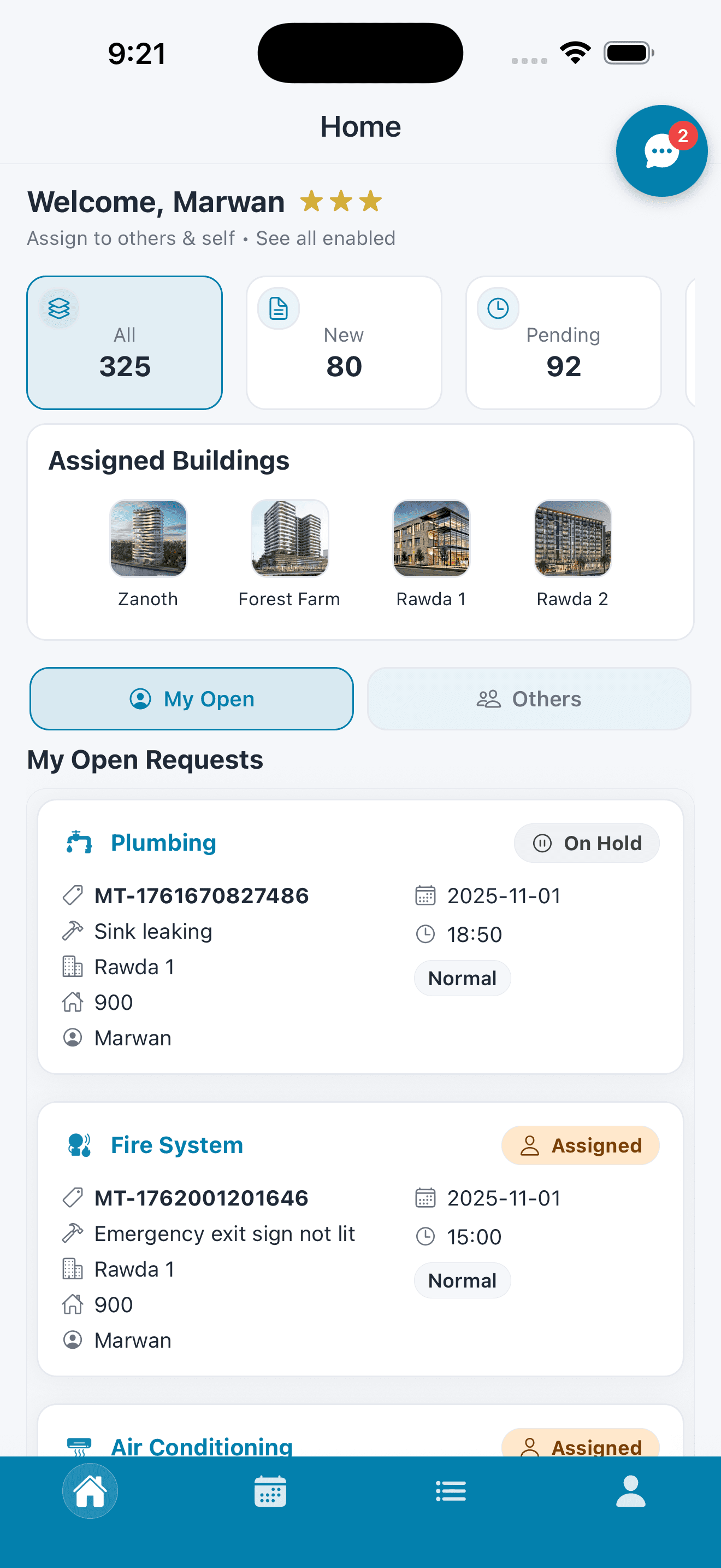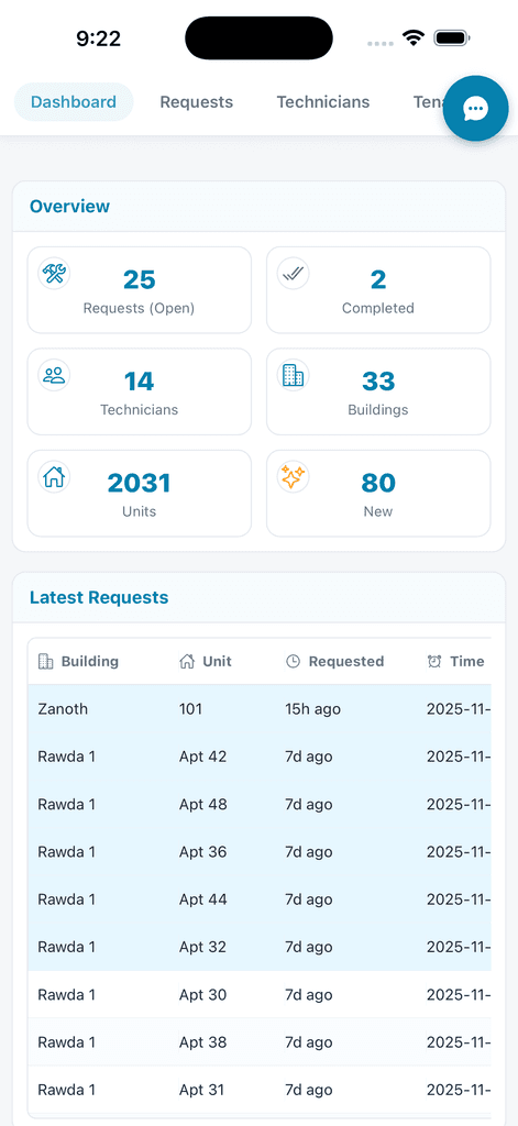 Run daily building operations from one dashboard—requests, approvals, inventory, cost control, reports, and built-in chat (no more WhatsApp/spreadsheets).