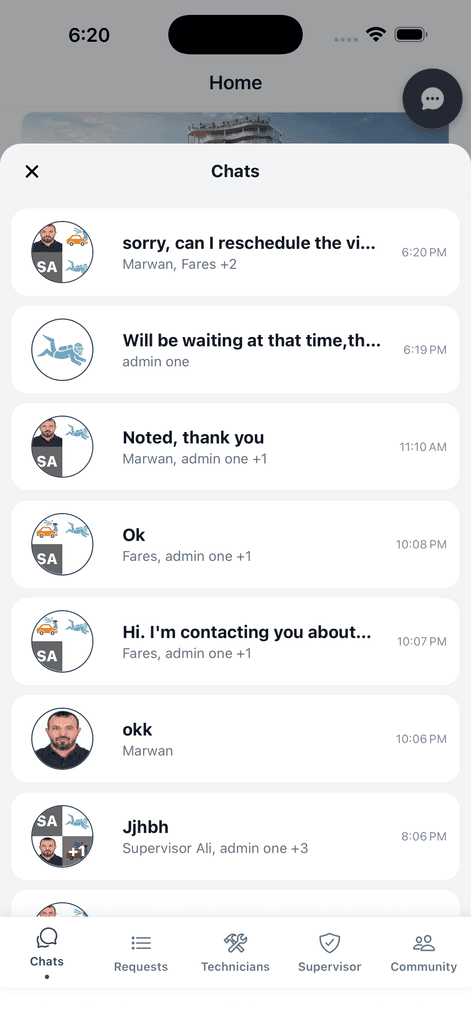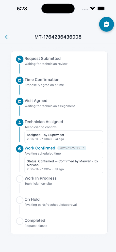 Technicians confirm visits and share timing through in-app chat, so residents know exactly when someone is coming to fix their issue.