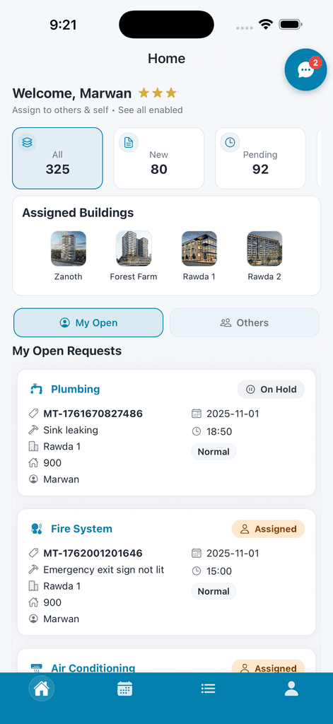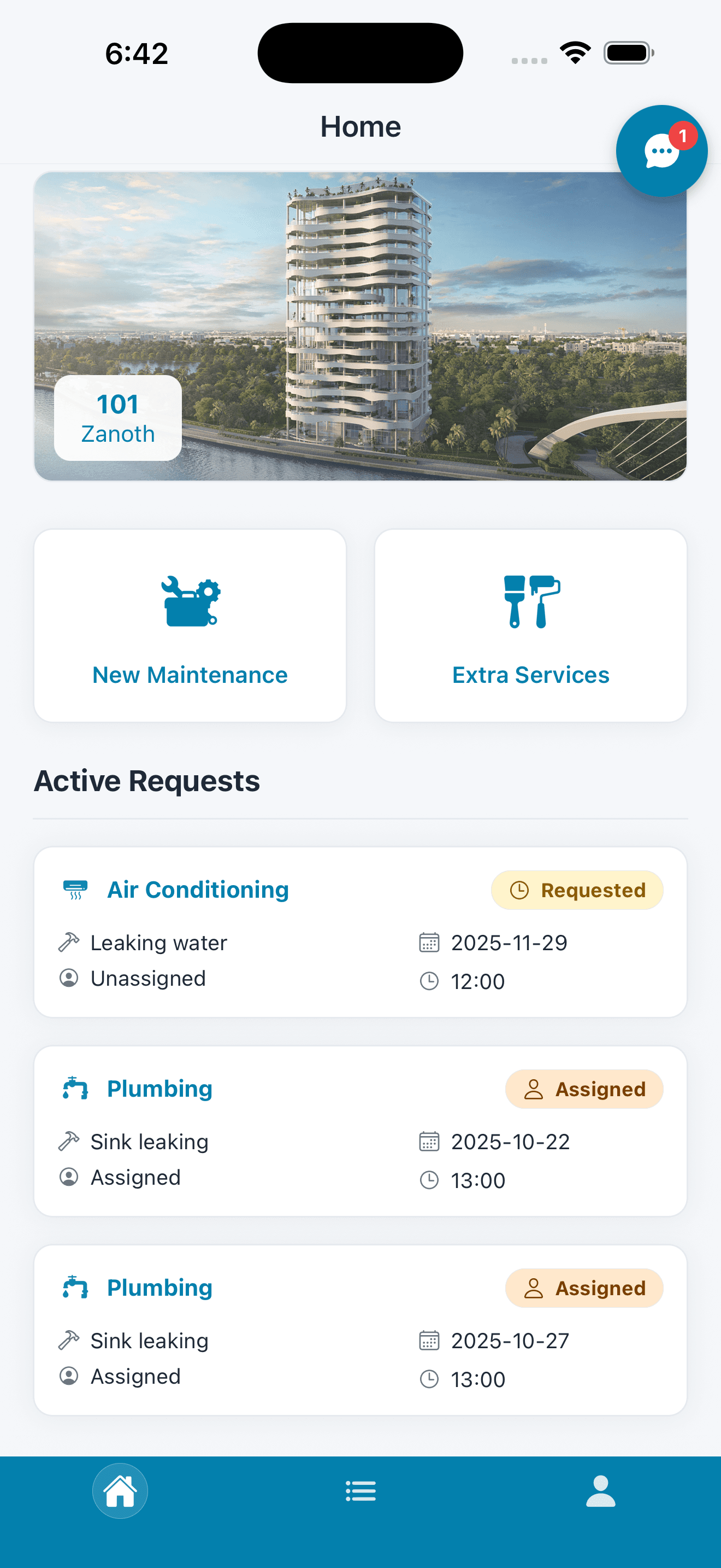 Request & track maintenance in a few taps. select a category, describe the issue, add photos and choose a preferred time. Requests go straight to the right building and team, and tenants can follow every update from “Requested” to “Completed” inside the app.
